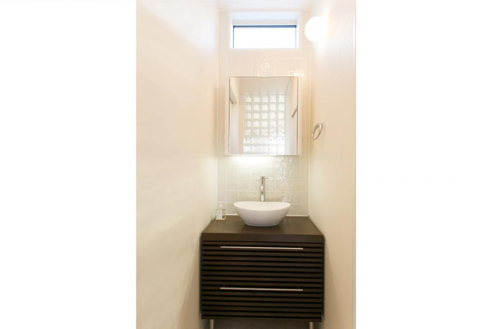 リビングの壁をガラスブロックにし、暗くなりがちな北側の洗面にまで光が届き明るい空間になっています。