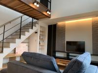 タイル&間接照明、リビングへ入るドアをハイドアを採用しました。間接照明が暖かい雰囲気にしてくれます。個だわりの造作テレビボードが目を惹きます