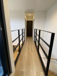 主寝室からトイレ、洋室につながる2階通路にはアイアン手摺を採用し、カッコイイ空間にしました
