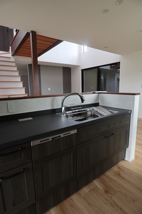 キッチンはLIXIL リシェル スモークウォーク、天板にはセラミックを採用しまいた。シックな色合いのキッチンです