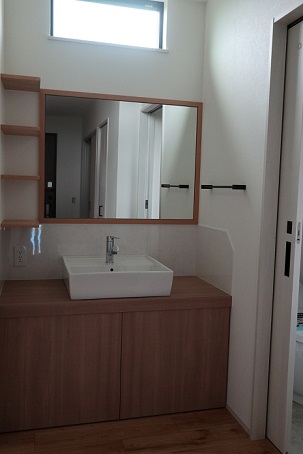 お施主様が帰宅後にすぐに手を洗いたいとご要望があり、玄関正面に造作洗面を設置しました(^^)