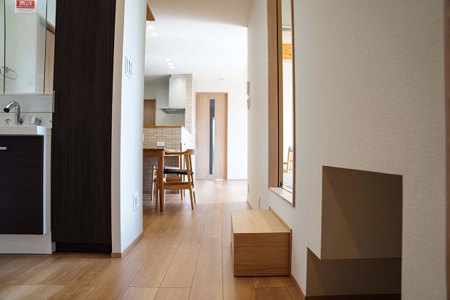 ・玄関入ってからキッチンへ繋がる通し土間を採用