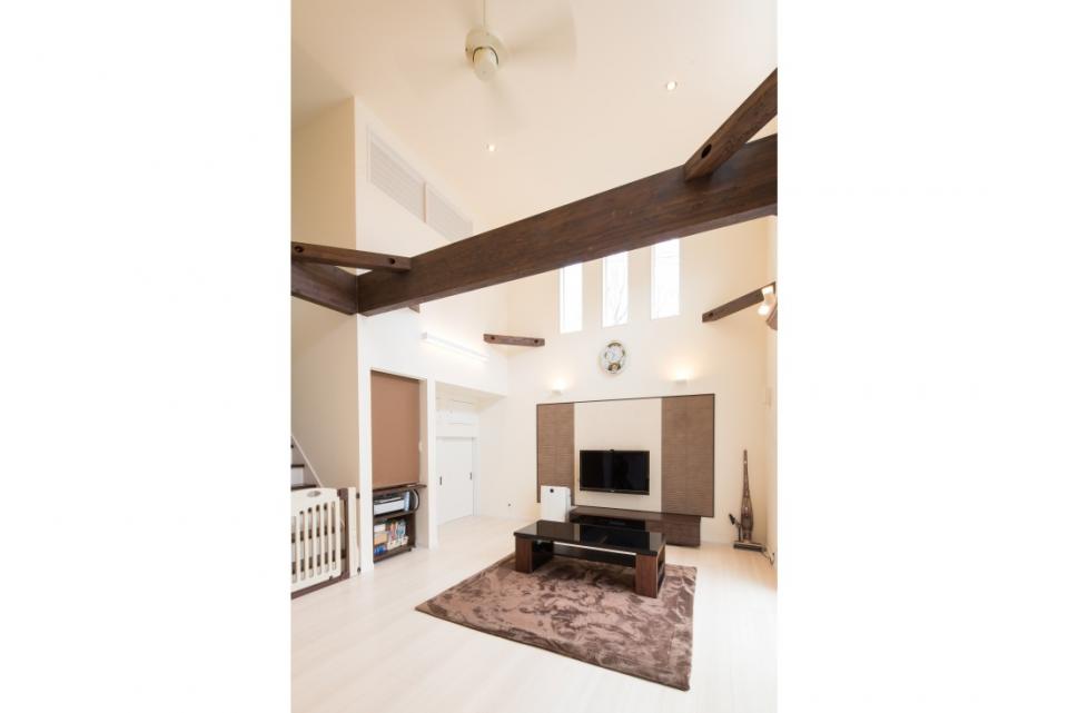 吹抜けのある開放的なリビング。リビングコンテナなど収納が豊富なのですっきりとした印象ですね。