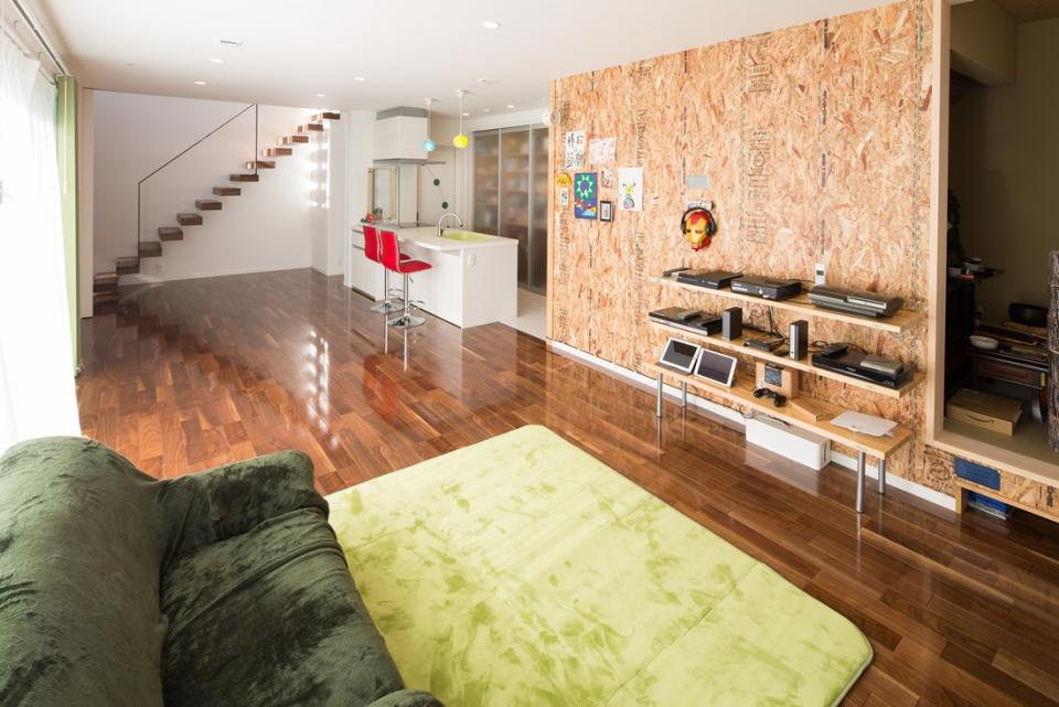 リビング北側には、旦那様のコレクションであるブリキ看板を飾ることの出来る、OSB合板仕上げの壁を設けました。