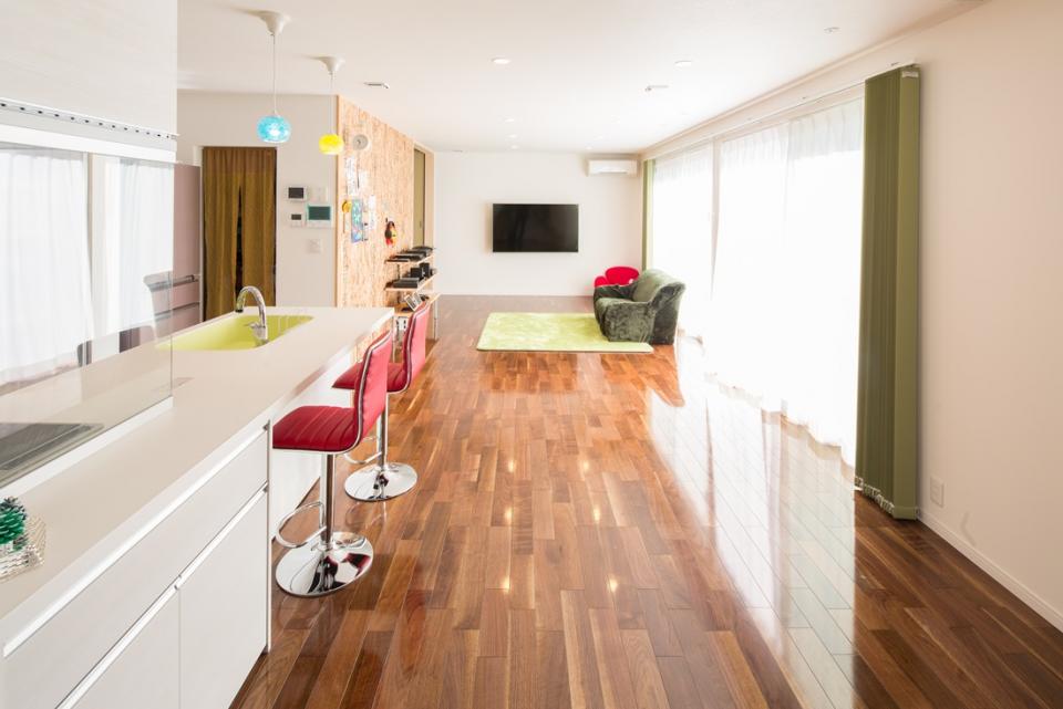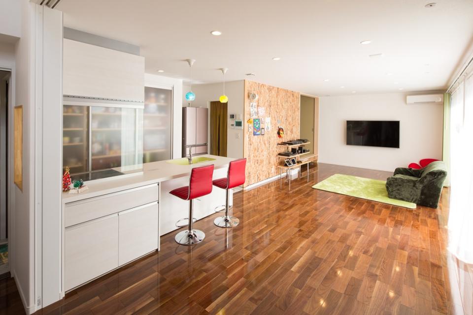 リビング北側には、旦那様のコレクションであるブリキ看板を飾ることが出来るOSB合板仕上げの壁を設けました。大好きな物が日常の生活に自然と溶け込んでいる、理想の住まいが完成しました。