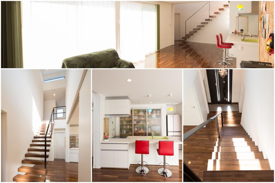 玄関ホールの片持ち階段が来客者を圧巻します。