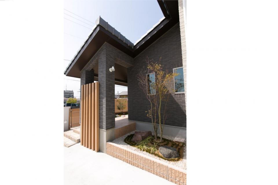 総タイル貼りで重厚感のある佇まい。 大屋根と深い軒が印象的な外観です。