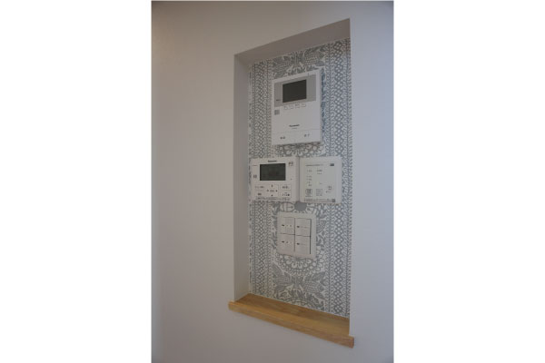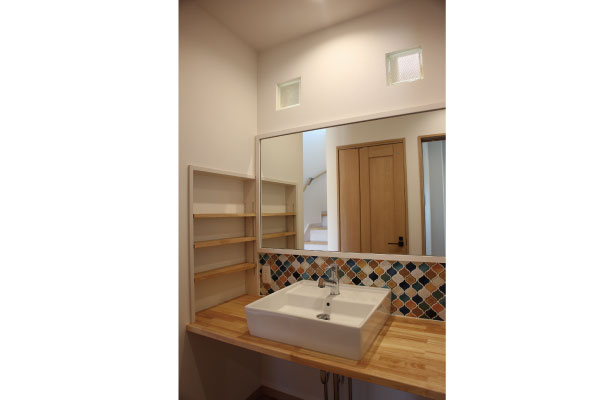 奥様こだわりのタイルを用いた造作の洗面化粧台。 サイドには造作収納棚の完備